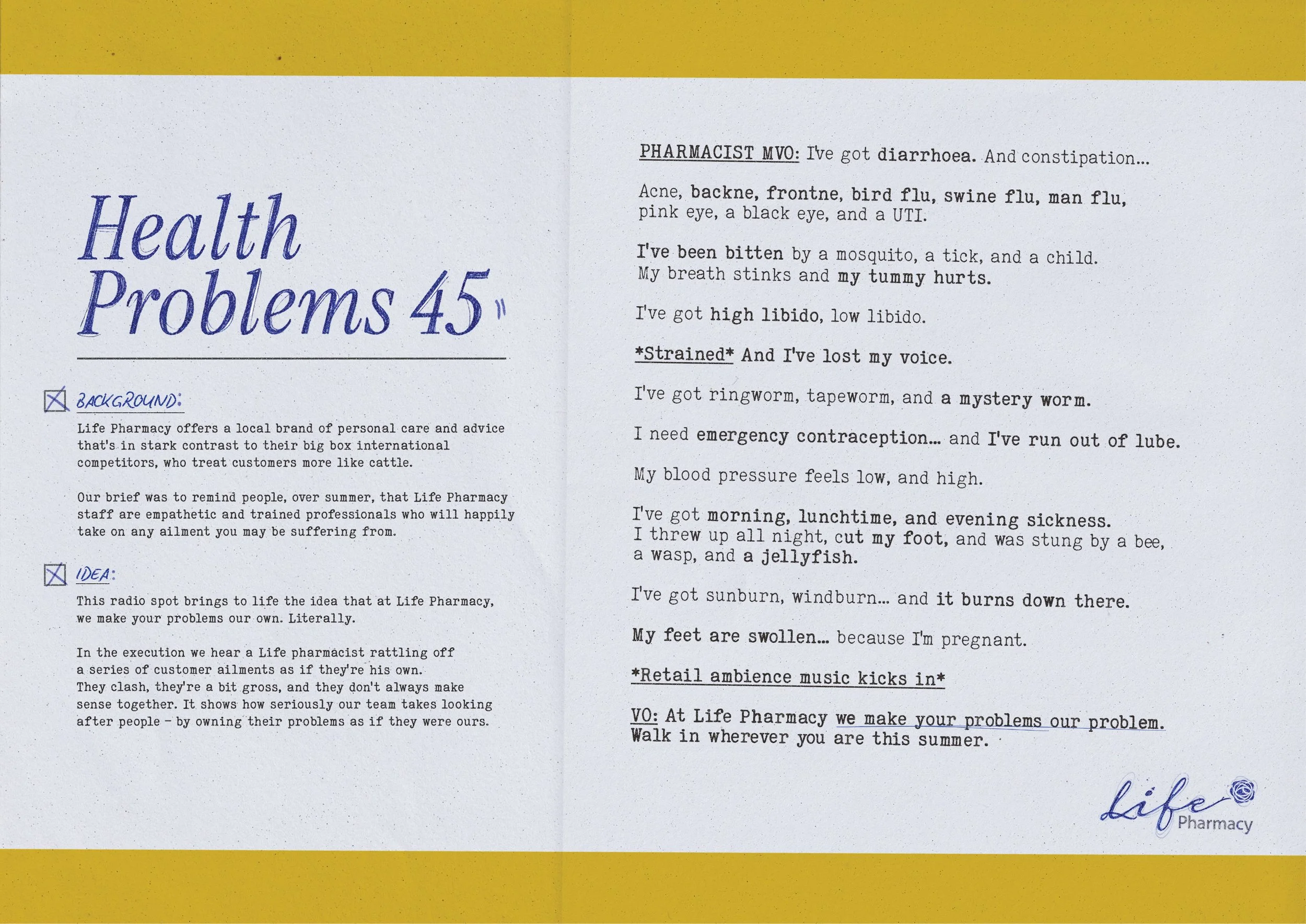 This radio spot brings to life the idea that at Life Pharmacy, we make your problems our own. Literally.